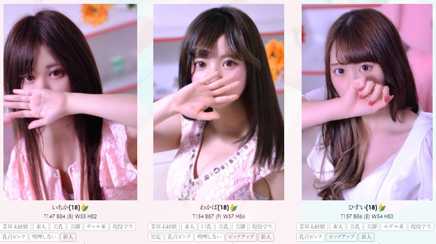 女の子たちの写真もきらびやかで、バシバシのギャルメイクな嬢が多いですね。10代から20代前半の娘がほとんどです。こちらもピチピチギャルですね。