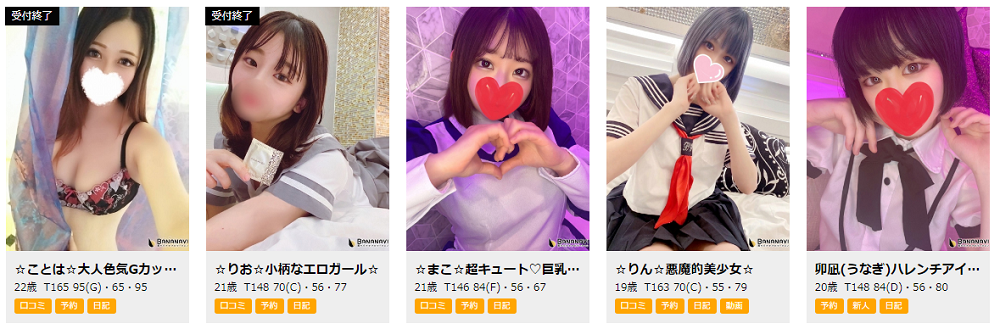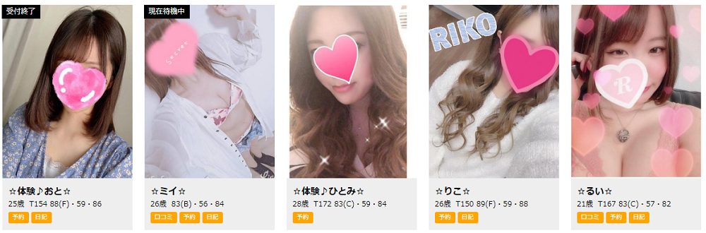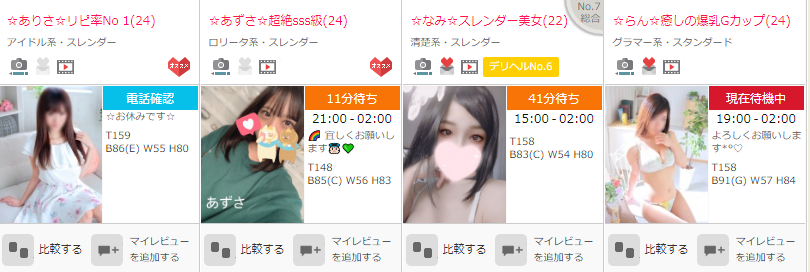 営業時間が10時~翌3時までの17時間と、長く好きな時間に呼ぶことができるのは利点です。人数も少ないらしく、口コミでも挙がる嬢の名前はかなり少ないです。