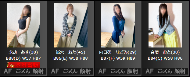 しかし、全員が全員AF対応ができるわけではないので、AF可能嬢かどうか確認は必要ですね。他にも乱交コースなどもあるので、熟女達と友人と賑やかなエッチを楽しめるという愉しみもあるお店です。