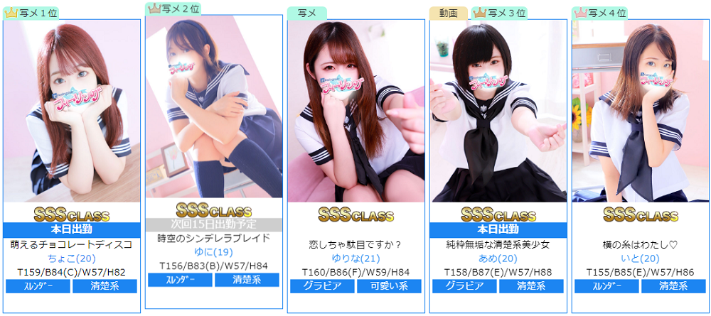 乃木坂46や日向坂46など、坂道系アイドルグループにいるような、煌びやかな女性とプレイできる期待が持てるお店です。