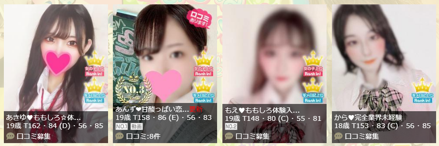 体験談は少数ながらも”この店はだいたい基盤”という情報があったり、「ロハ生中OK嬢」が8人いるという口コミもあったりして、オキニ隠しされている本番あり嬢が多い印象を受けました。