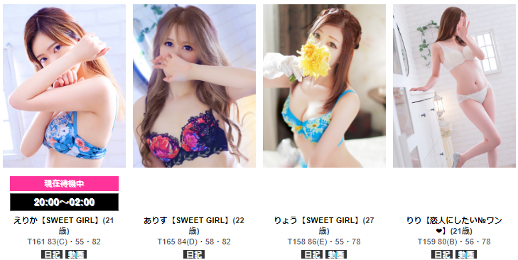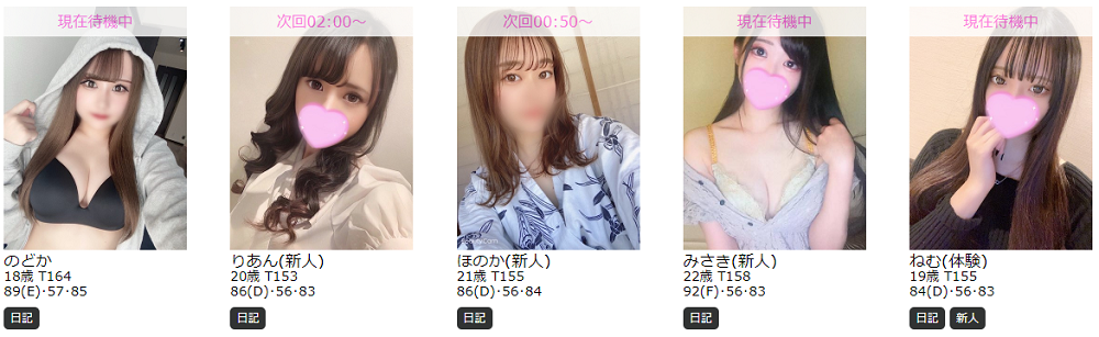 10代後半から20代のかわいい系からキレイ系までの女の子が多数在籍しています。出勤率も高めなので、お気に入りのキャストが見つかるかもしれません。また、新人も多く在籍していることも魅力のひとつだと思われます。