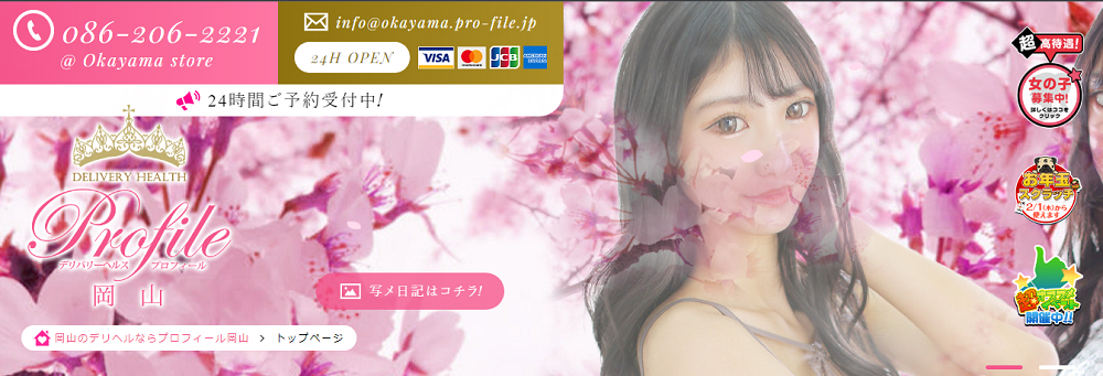岡山デリヘル「プロフィール」は、毎日の出勤人数が20名を超えていて、若くて可愛い女の子の即ヒメもほとんどのタイミングで可能です。