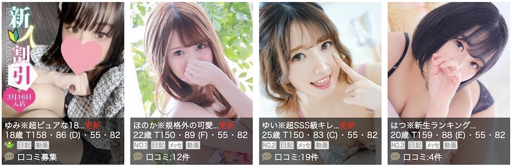 10代から20代前半の女の子が70名以上在籍していて、プロフィール写真で顔出ししている子が多いのもいい!さらにリアルな写真は、写メ日記にもあるのでいろいろな妄想をしながら気になる子を見つけるのも楽しいと思います。