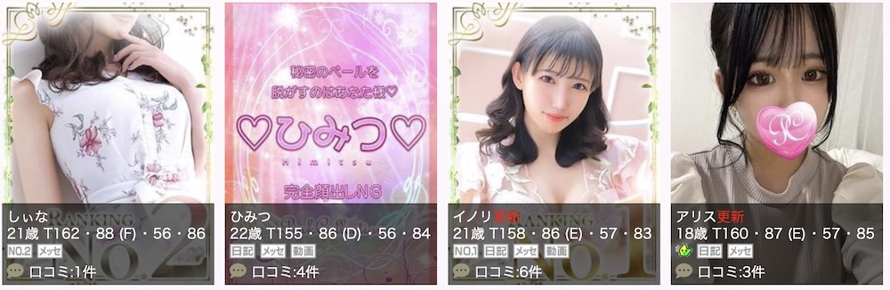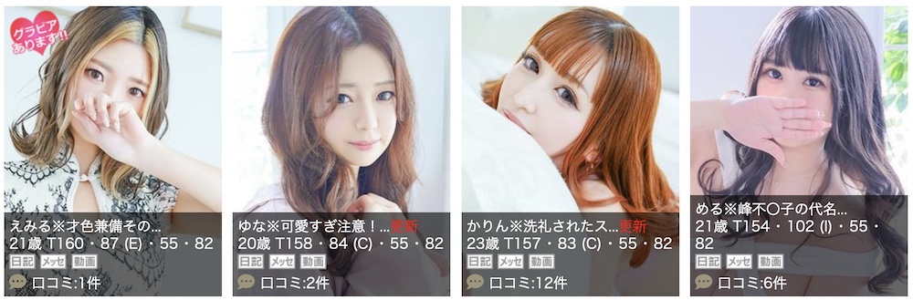 プロフ写真だけでもなんとなく分かるので指名しやすいと思います。写メ日記や動画もあるので顔出ししていない子も、指名しやすいのではないでしょうか。