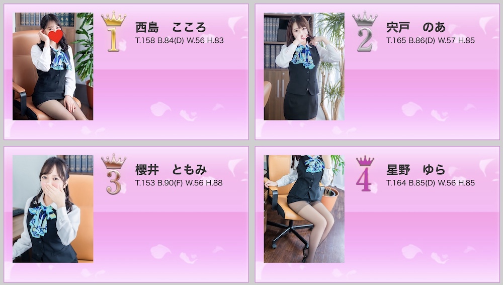 10代から20代前半の綺麗系・清楚系のスレンダーな在籍社員が40名ほど在籍しています。プロフィール写真では口元を隠している女の子が多いですが、目元が出ているので指名しやすいのではないでしょうか。