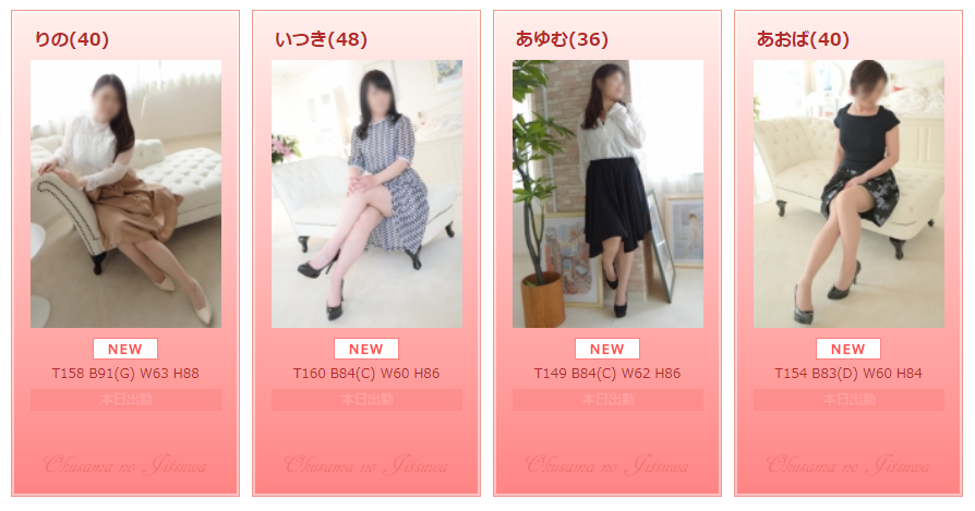 在籍キャストは240名近くです。HPの奥様在籍表では残念ながら顔出しはありませんが、全体的に皆さん脚がきれいでびっくりです。