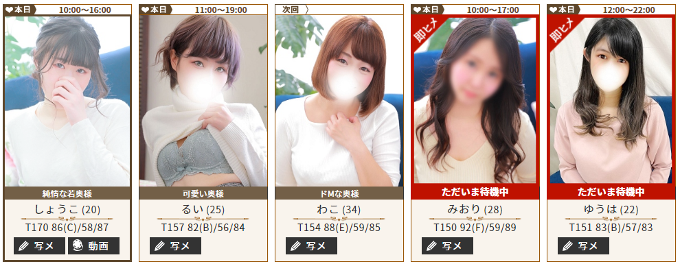 西川口ホテヘル「西川口人妻浮気現場」に在籍しているキャストの女性は、細身からぽっちゃりまで、様々な人妻嬢が在籍しています。年代は20代前半から、50代までと幅広く在籍していますね。