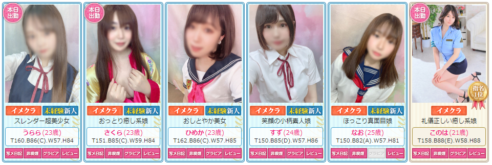 在籍している女性キャストは、清楚系から女子大生系・OL系の20~30代までの嬢が在籍しています。特に20代前半の可愛い系の女の子が多い印象です。
