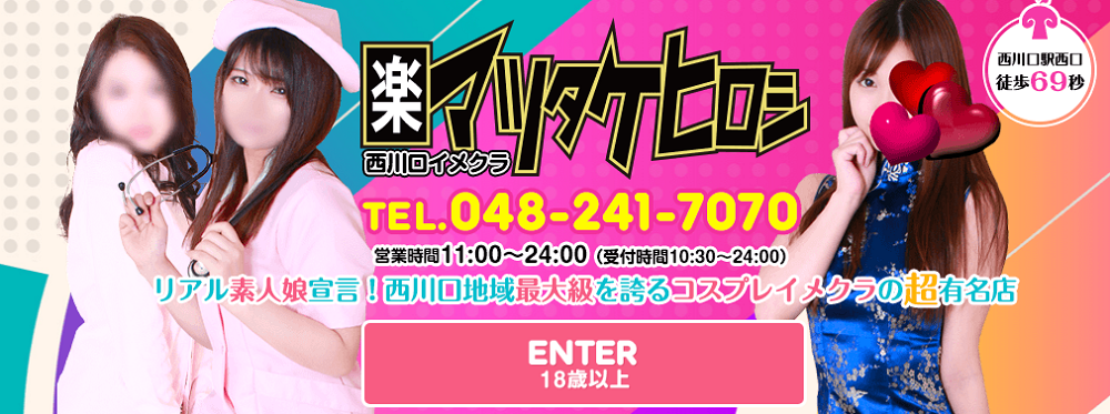 西川口ホテヘル「マツタケヒロシ」は、色々なコースがあり割引も豊富で初見でもリピートでも行きやすいコスプレイメクラです。こちらの店舗は朝10時から開店しており、早い時間から遊びたい方も気軽に立ち寄れます。