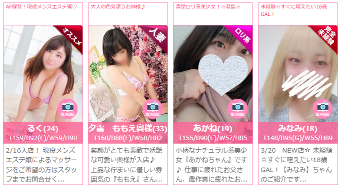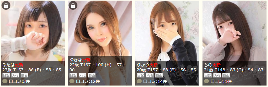 そして、なんといっても顔出ししている写真の女の子が多く、ギャルっぽい子や清楚系っぽいこもいますよ。HPで確認するだけでも在籍嬢のレベルはある程度把握できそうですね。
