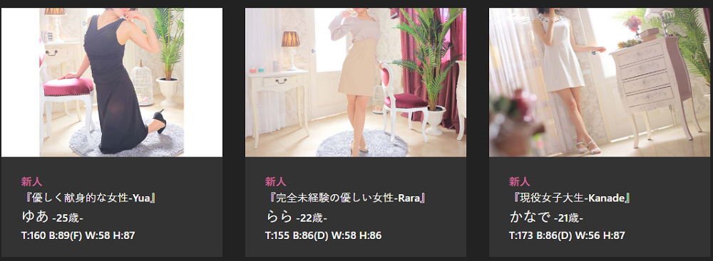 在籍している女性は、厳選された23名しかいません。数百名が在籍するお店もある中でこの数は、なかなかに厳選しているのがわかるかと思います。中でも1番若い子は19歳で、最上級生は35歳となっています。年齢層も幅広くカバーしていますので、好みの年代の女性は見つけられそうですね。