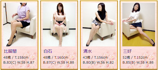 スレンダー系やモデル系の嬢が多く、この世代で、このボディを保っているのか?と目を疑う嬢も多いようです。年代で考えるとかなりレベルの高い女性を揃えているのではないでしょうか、さすがです。